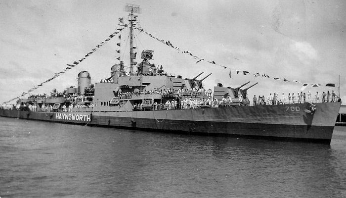 Kahulai Harbor, Maui, T.H.. The Haynsworth was full dressed, welcoming visitors aboard in celebration of Navy Day. |