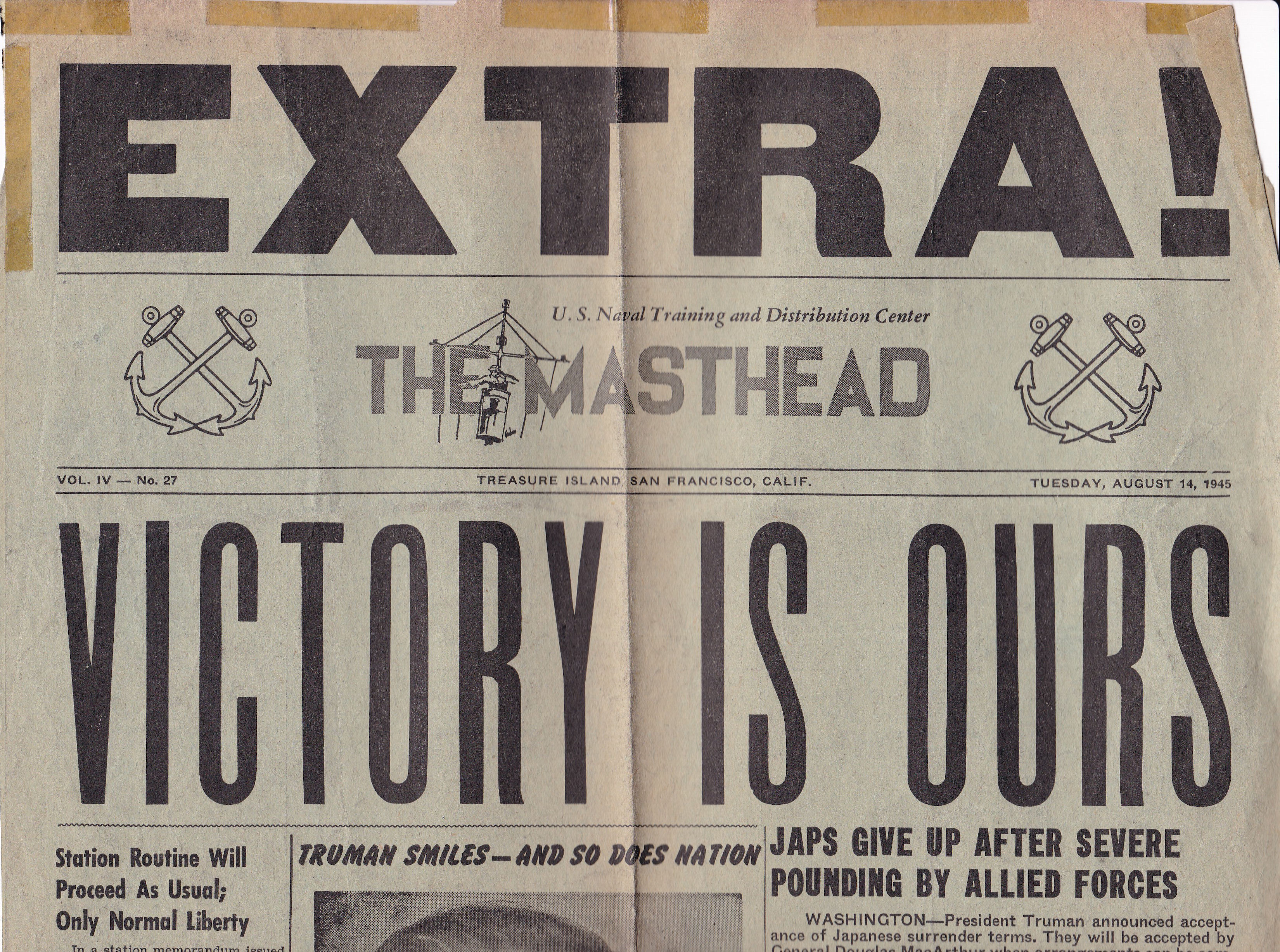 | August, 14 1945 ~ Treasure Island newsletter, The Masthead ~ Announced the war was over. | ||