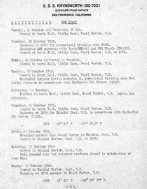 its travels to and from Middle Loch, Pearl Harbor, T.H. while they did a variety of daily training exercises, including participation in the Navy Day celebration. |