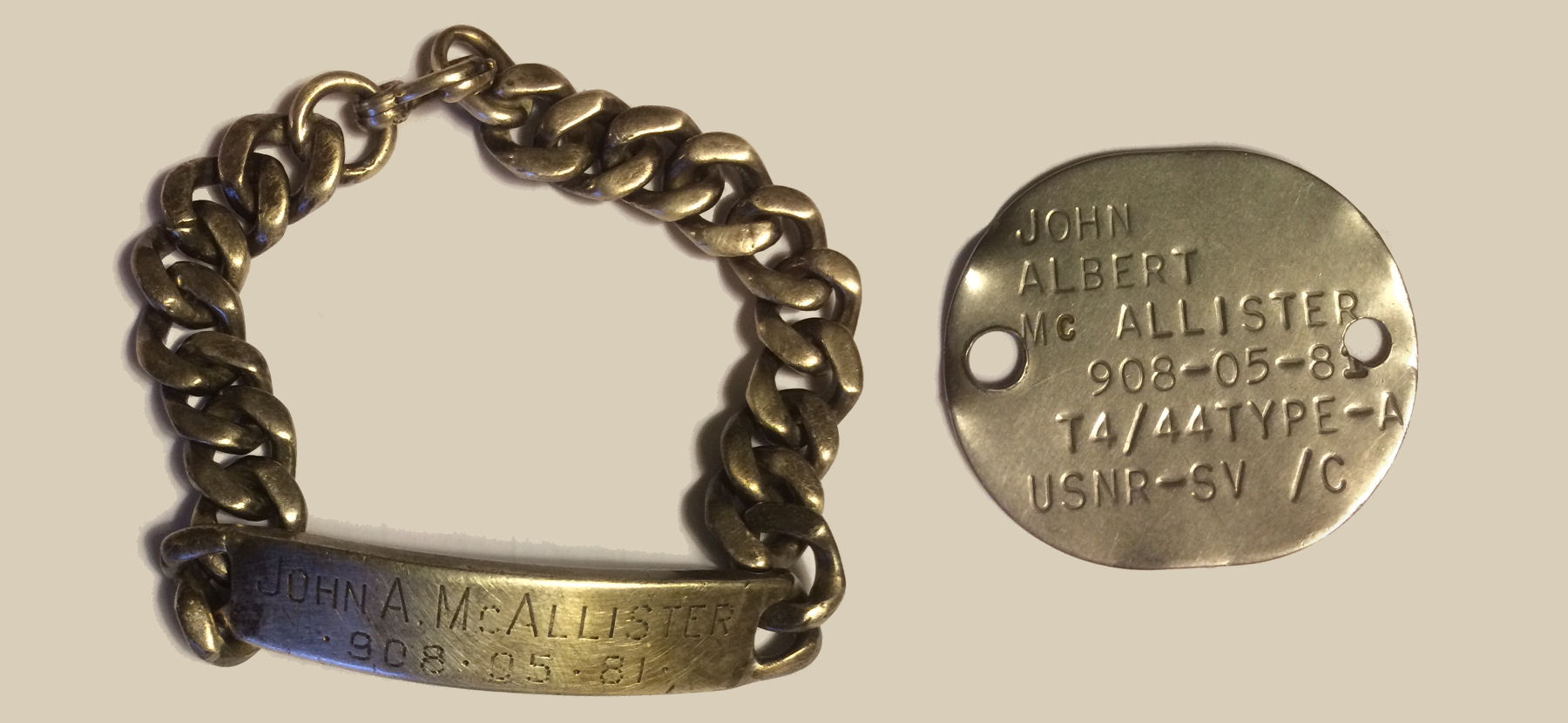 Photos of what a plankowner would have worn during WWII. They belonged to my father-in-law, Jack McAllister RM3c. The ID bracelet, though not Navy issue, was a common item worn by sailors. It is inscribed on the back "MOM AND DAD". |