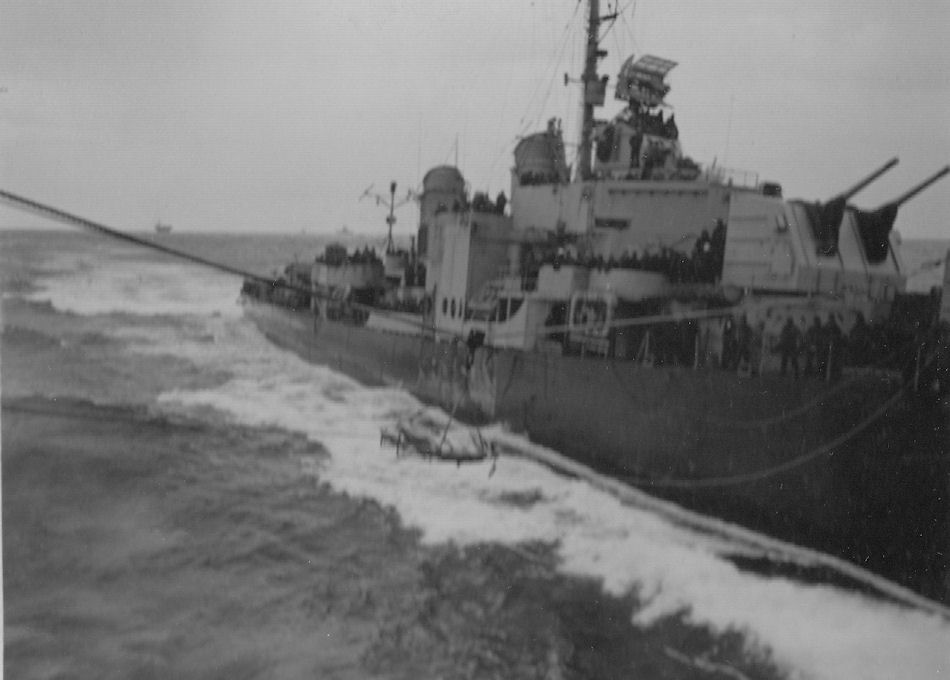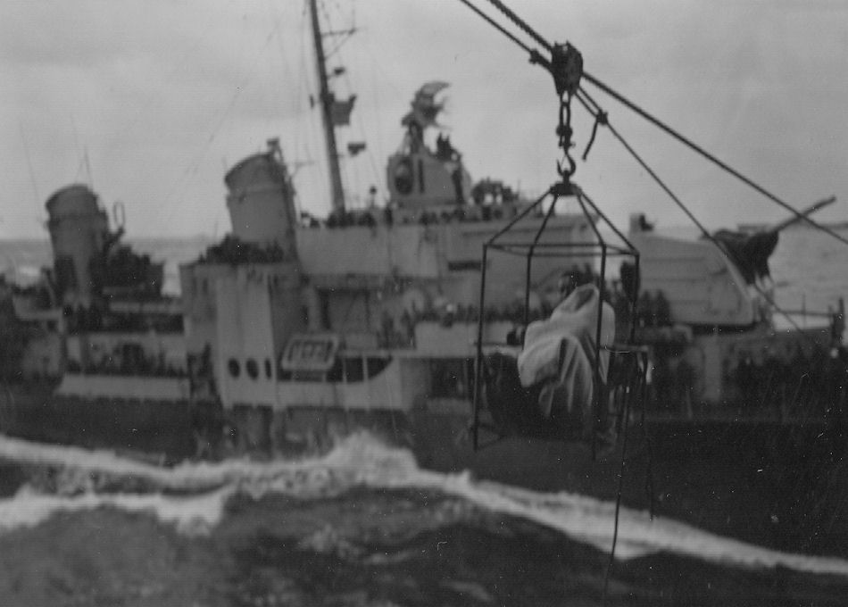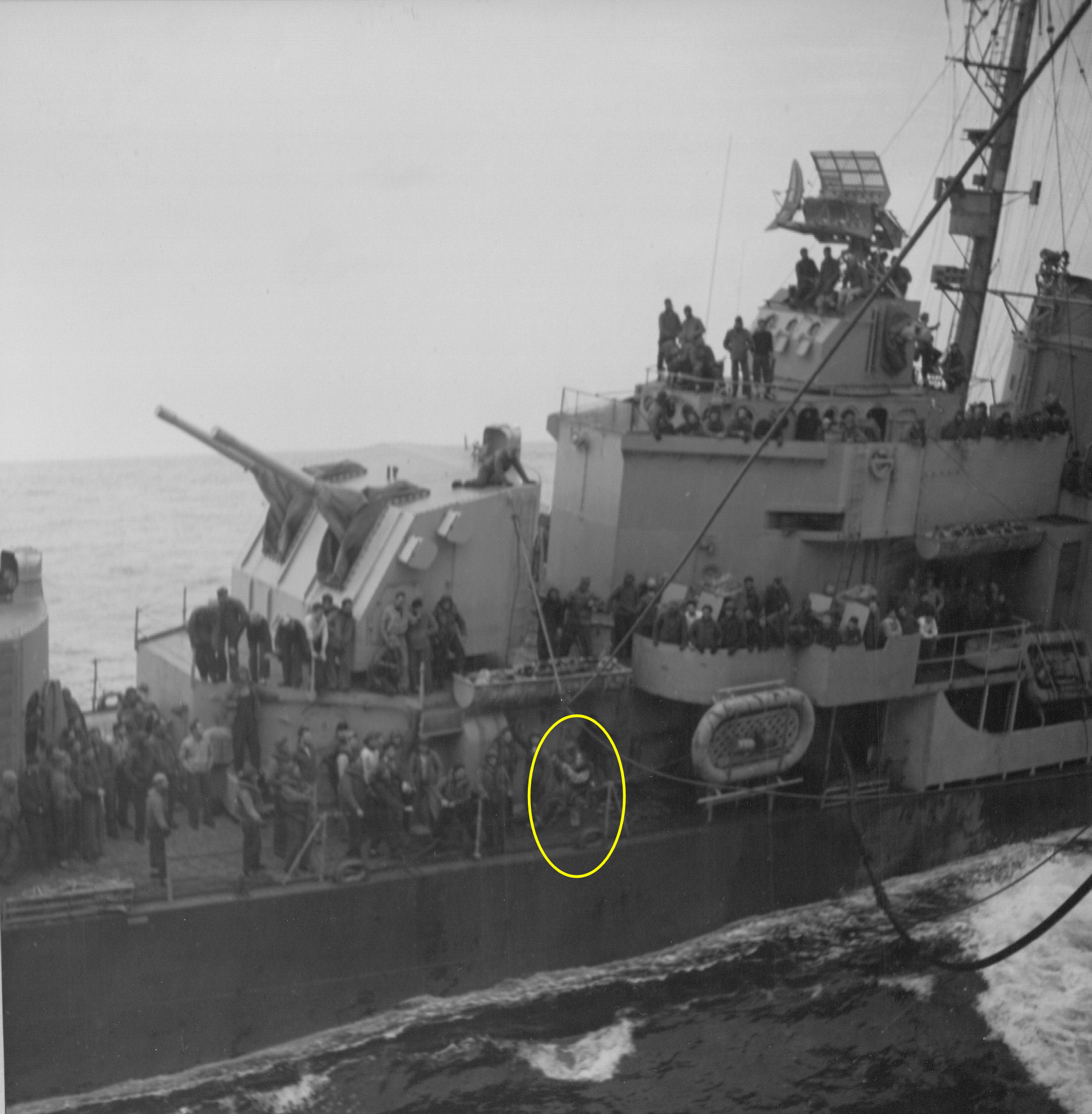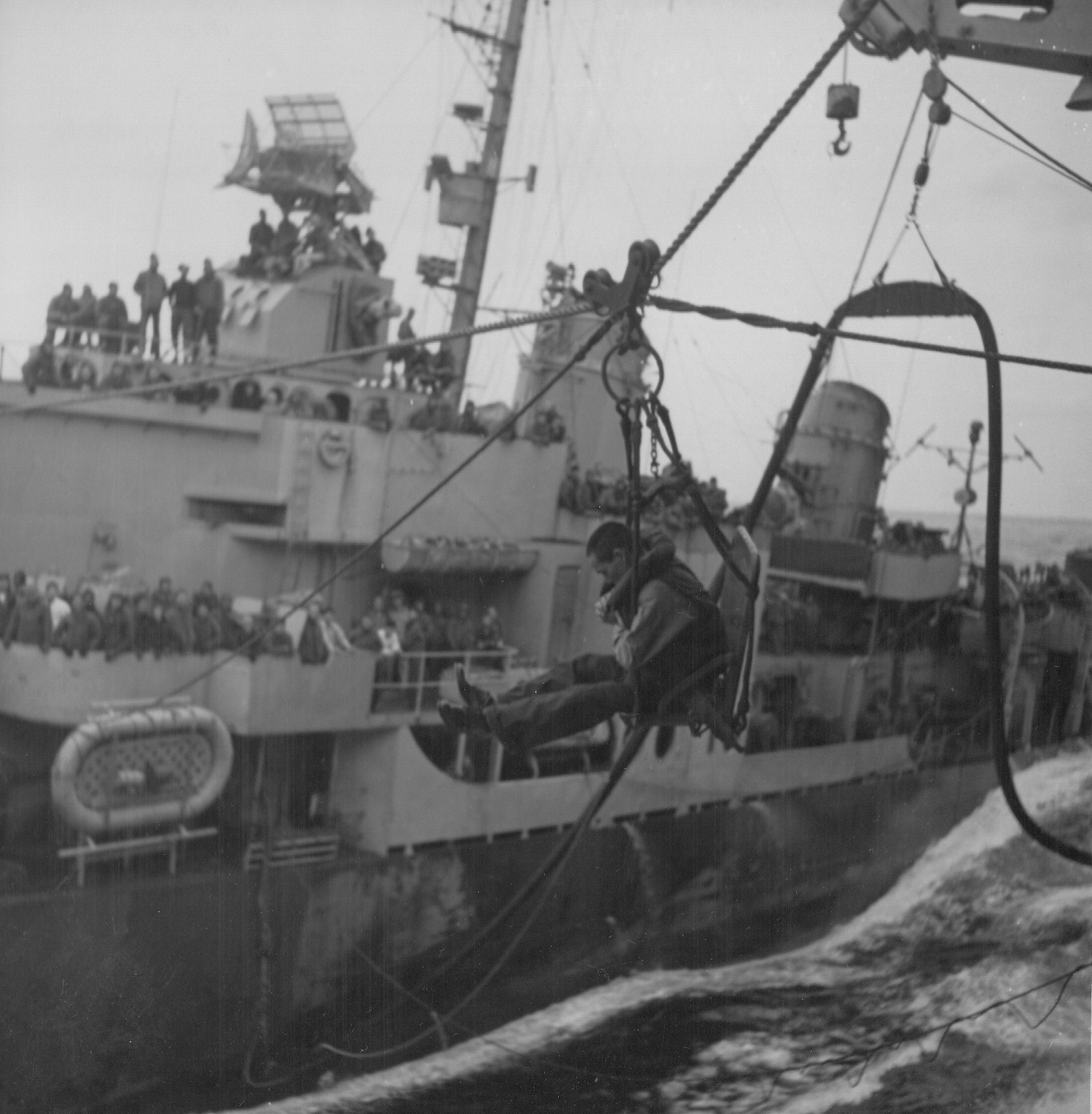 | USS Haynsworth DD700 transferring Japanese survivors to USS Bunker Hill CV17. | |