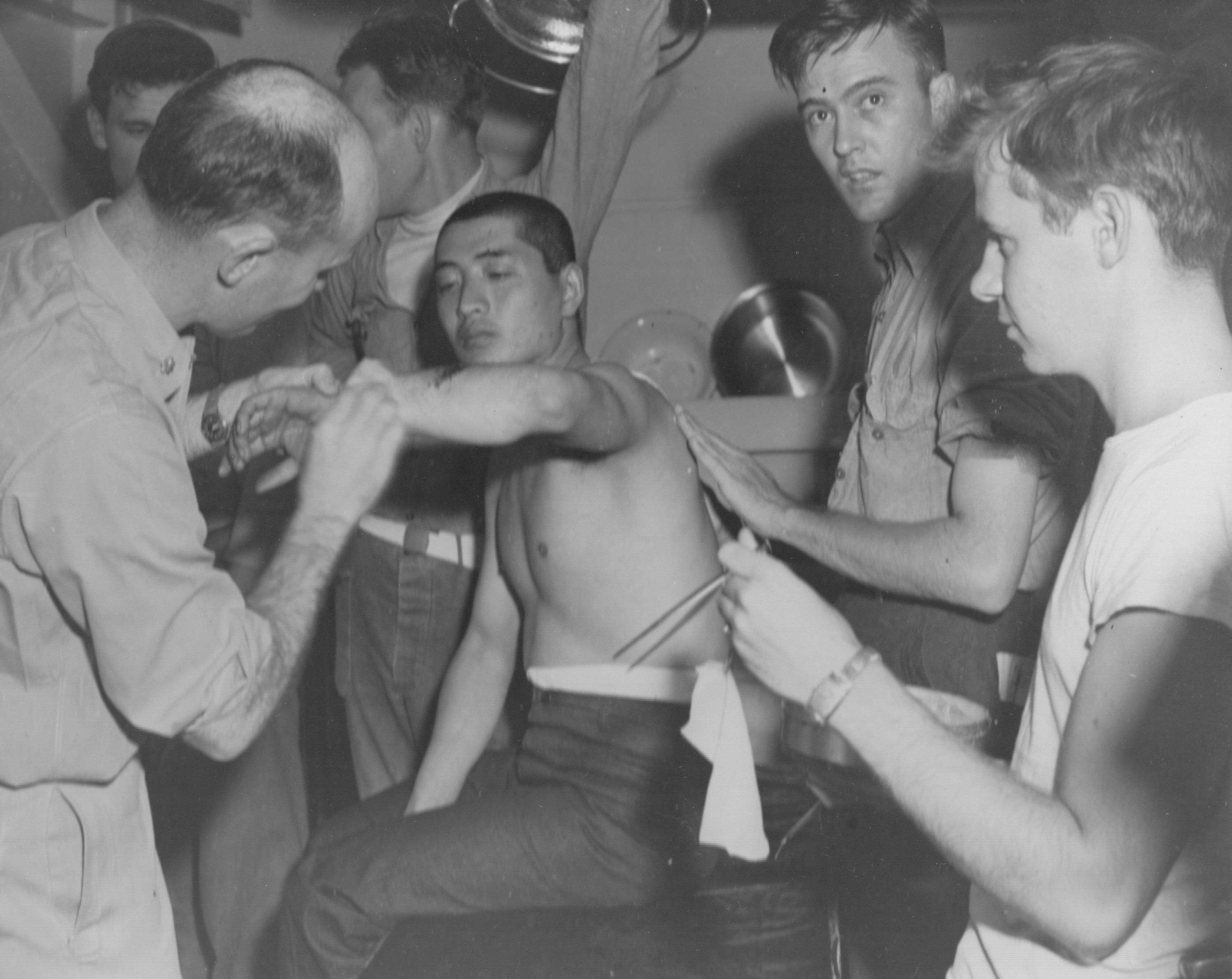 | Japanese survivors receive clean clothes, medical treatment and examination aboard USS Essex. | |