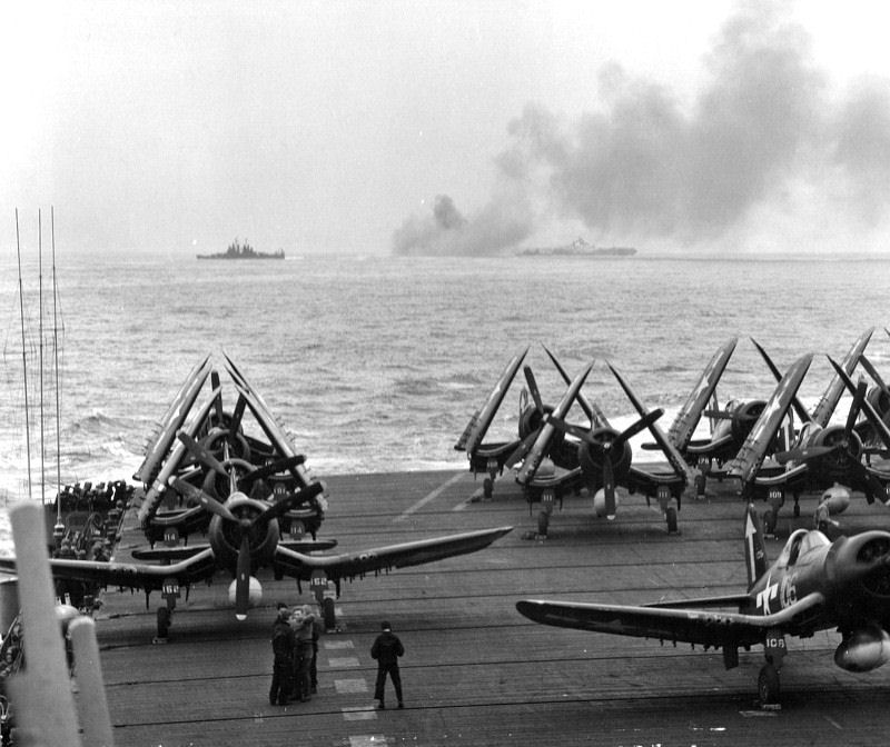 | Though the Haynsworth is not in this photo, it was nearby as part of Task Group 58.3. Twenty-four hours after the Haynsworth was hit, the USS Hancock CV-19 was struck. The Haynsworth rescued eight of her sailors that day. The photo was taken from the USS Bunker Hill CV-17. F4U Corsairs of Air Group 84 are warming up on deck. National Archives photo 80-G-259851. |
